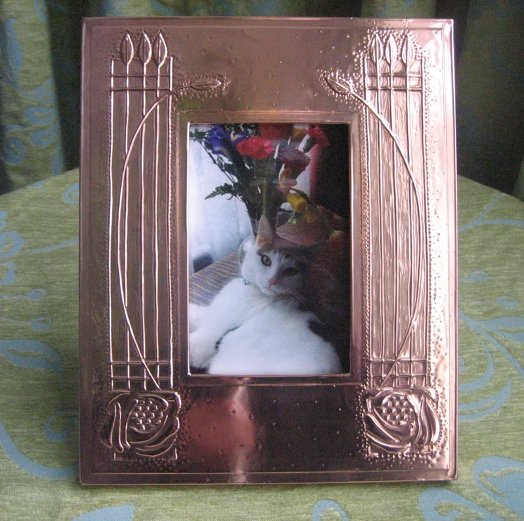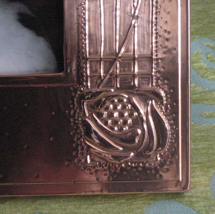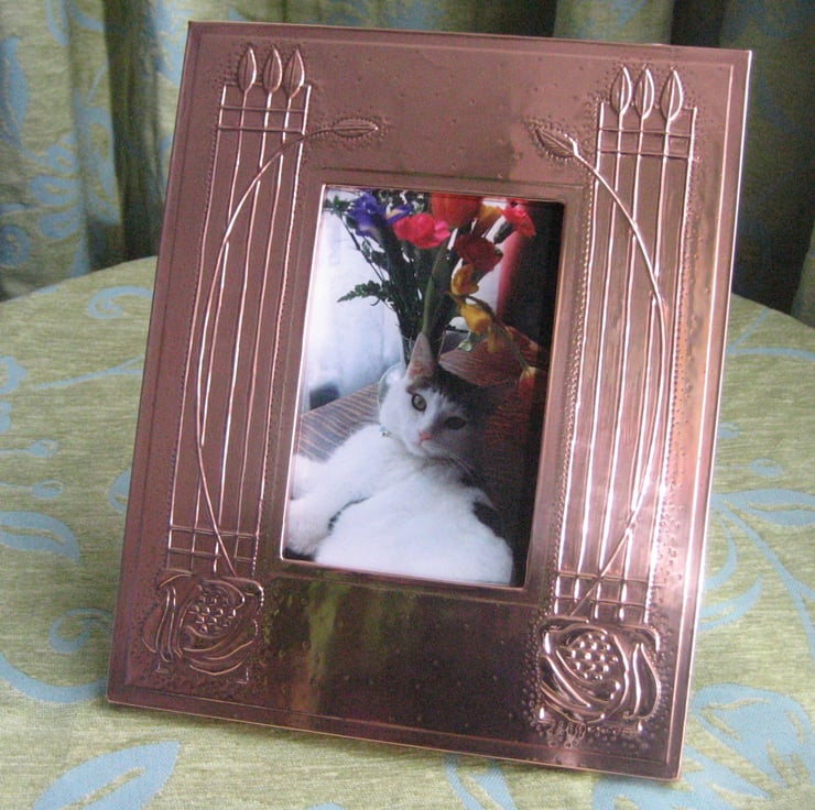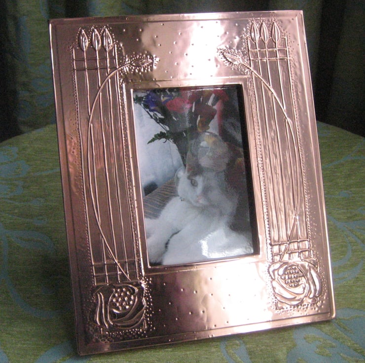 This frame has been hand-made in copper in the Arts and Crafts tradition. The design comprises elements of the work of Charles Rennie Mackintosh and the copper has been patinated and polished to a rich finish. This would be a lovely gift for a 7th wedding anniversary.