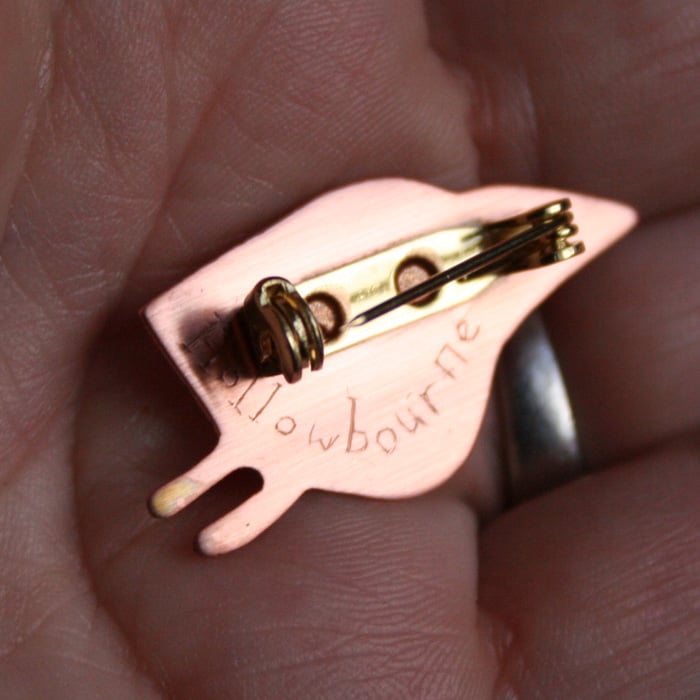 It is lacquered and has a safety catch soldered to its back, and is signed Hollowbourne.