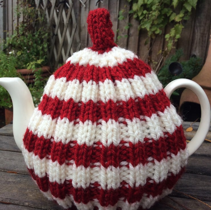 This hand knitted stripe tea cosy, comes in a vibrant dark red and cream giving a cosy feel for your home and your tea pot. Now made in a thicker cosy Aran thickness yarn making it chunkier.