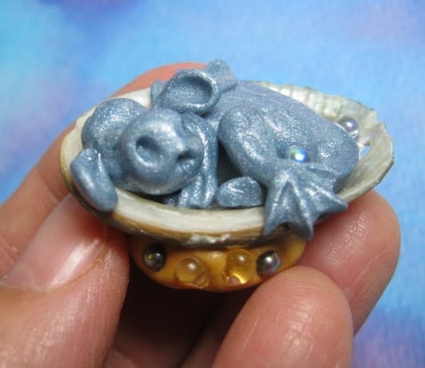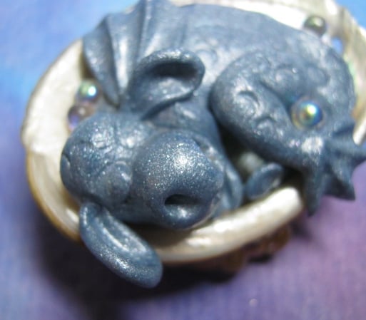 Elf-World Creations is pleased to present Farley, an adorable little urchin dragon baby just snoozing in his seashell. Farley has the sweetest nature, curled and cosy in this pearly shell which has been mounted on a modelled base with iridescent bubbles. When he wakes up he will receive messages from the Elf World Core detecting the movements of Ocean-Demons. Farley is a silent, sleepy Defender of the Realm.