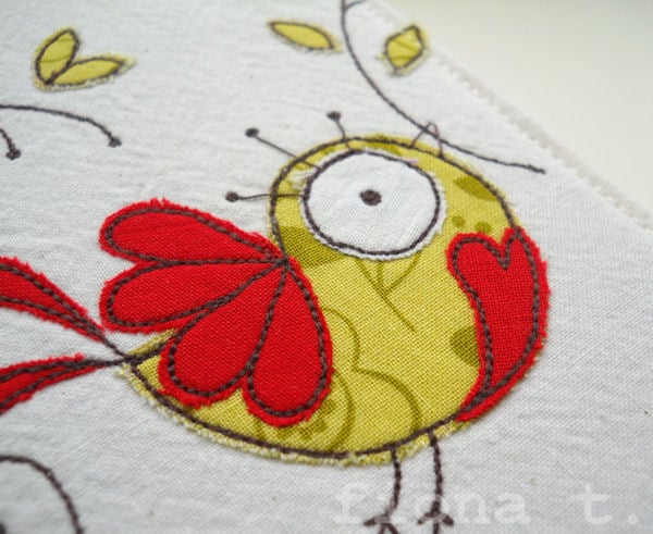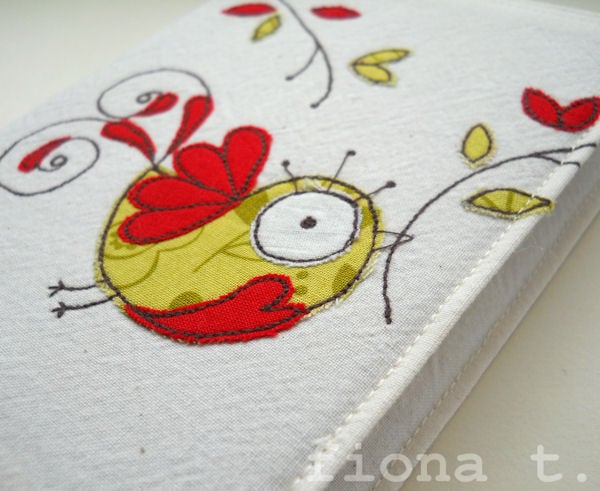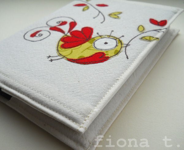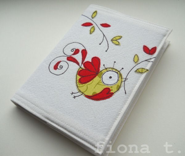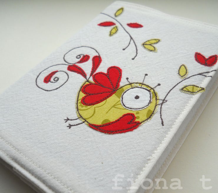 this pretty notebook cover features an appliqued and embroidered peace dove on the front cover. based on an original drawing by Little Black Heart, it is entirely handmade by me on a domestic sewing machine.