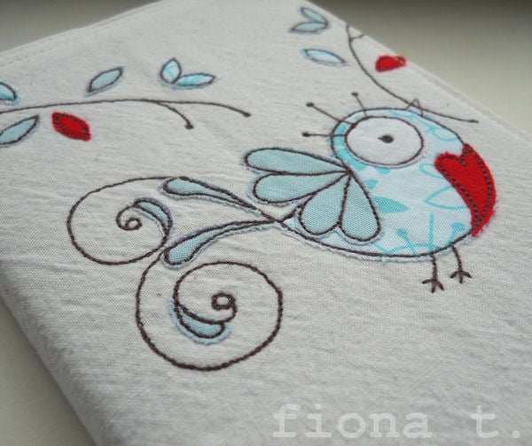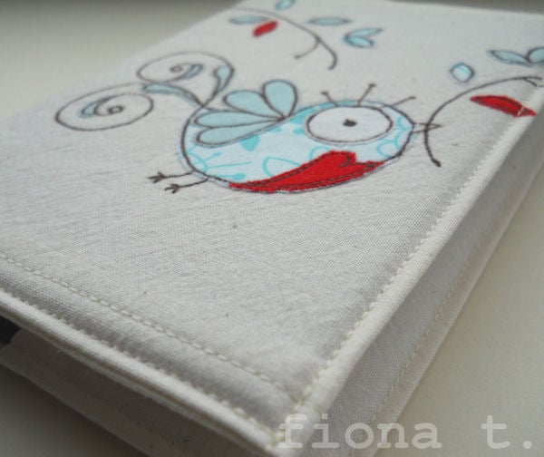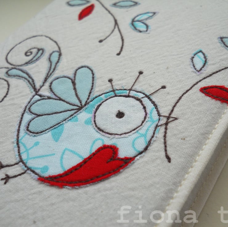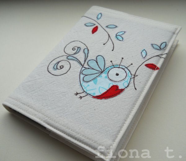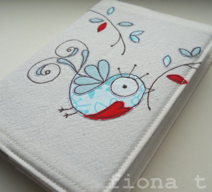 this pretty notebook cover features an appliqued and embroidered peace dove on the front cover. based on an original drawing by Little Black Heart, it is entirely handmade by me on a domestic sewing machine.