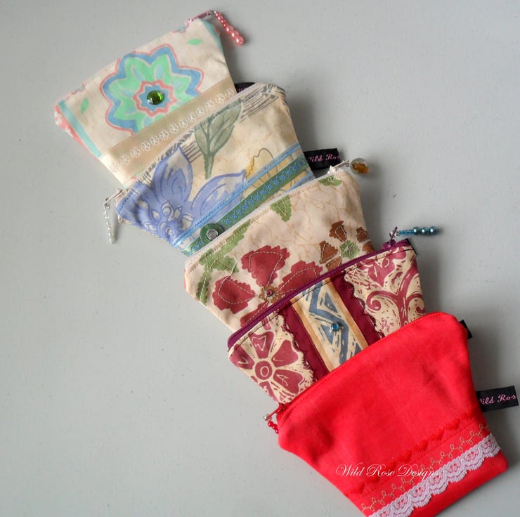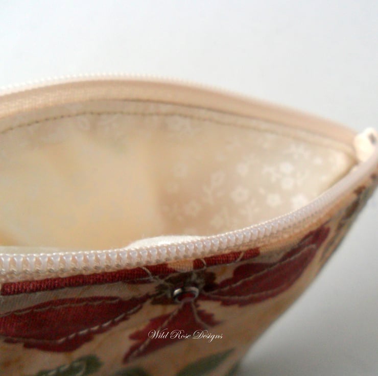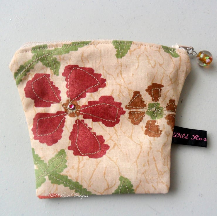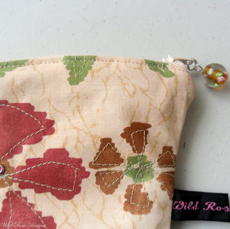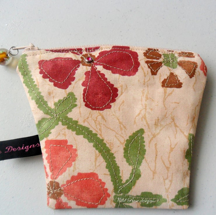 Another lovely handmade purse in a floral cotton print. This time I have stitched over the design giving a quilted effect. At the centre of the large flowers I have placed a diamante brad. Inside the purse is lined in a cream cotton print and it closes with a cream zip. There is a matching glass bead attached to the zip pull.