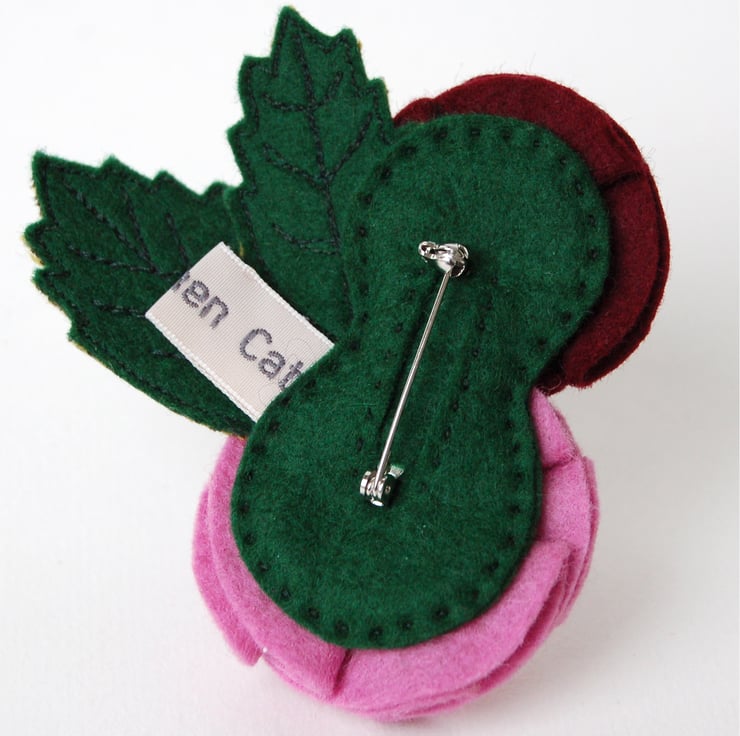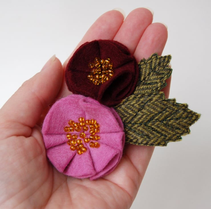 A rose flower brooch made with wool felt and amber glass beads. The leaves are stitched in free-motion machine embroidery on green tweed with a felt backing and a brooch pin neatly attached.