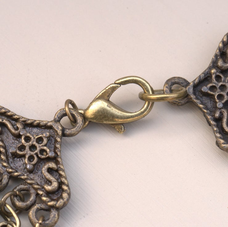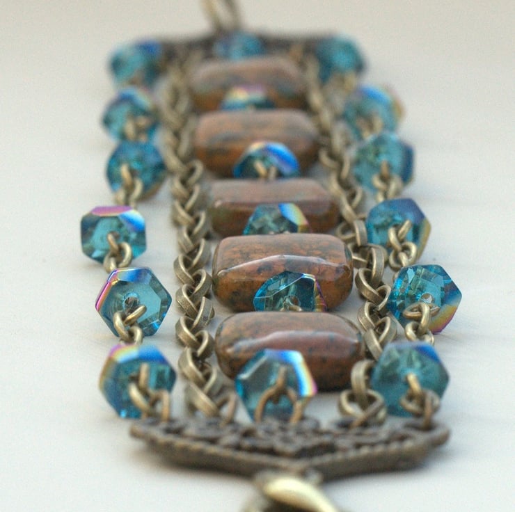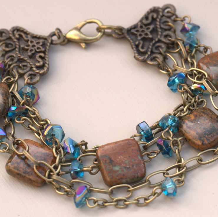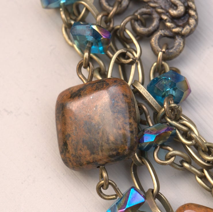 A multi-strand bracelet comprising of 2 strands of turquoise glass faceted rondelles with a lovely AB sparkly finish, 2 strands of antique bronze plated chain and one strand of beautiful Rainbow Jasper square beads teamed again with the turquoise glass rondelles with decorative connectors and finished with a trigger clasp.