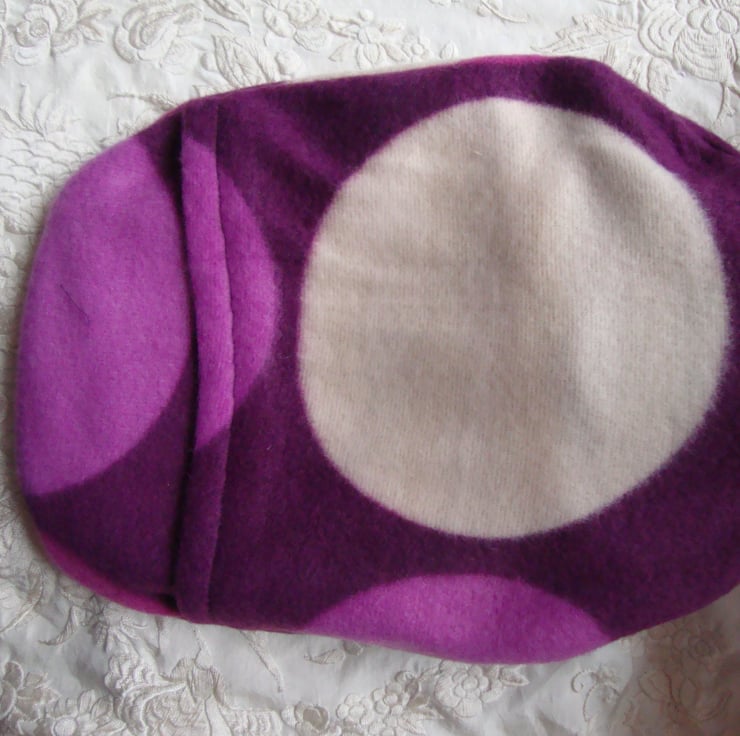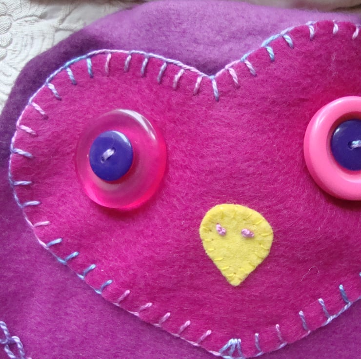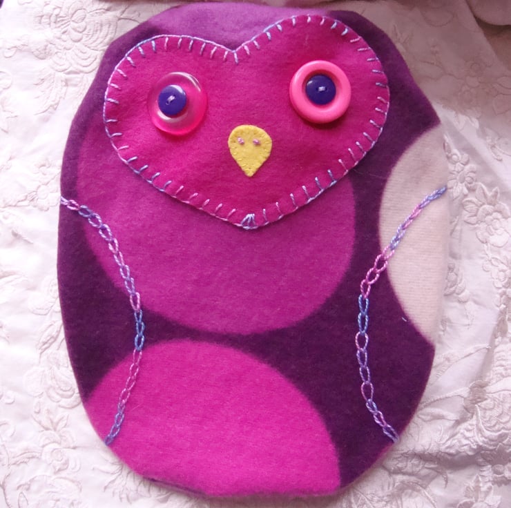 A lovely little owl to keep you company and keep you warm. This owl is made from upcycled fleece blanket with a felt face and beak and button eyes. All the details are hand stitched in chain stitch and blanket stitch. The cover is an overlap style. Inside is a new mini hot water bottle, just the right size for snuggling on the sofa or to warm your toes. The cover measures approximately 28cm x 17cm.