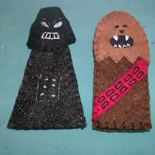 The forces of good agains evil: Darth Vader takes on Yoda & Chewbacca... These 3 funky finger puppets are handmade out of felt and embroidered. They are approximately 6.5cm tall and 6cm wide and securely stitched, making a lovely present for any Star Wars fan and Jedi wannabes!
