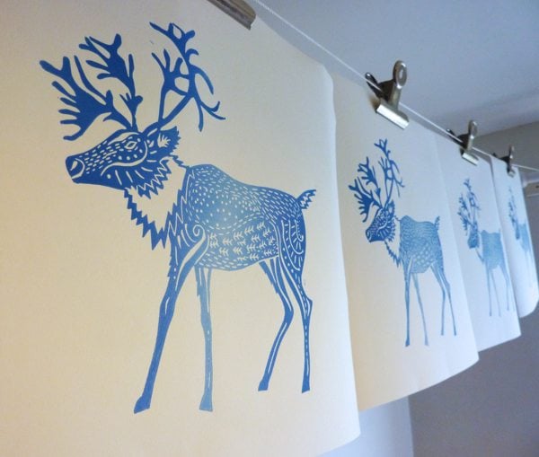 Original lino cut print Ice Blue Caribou.