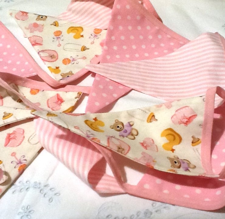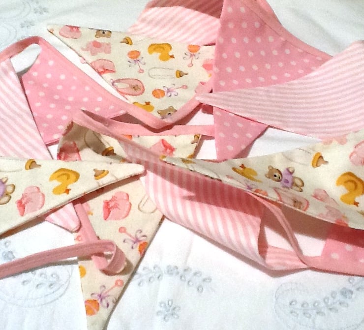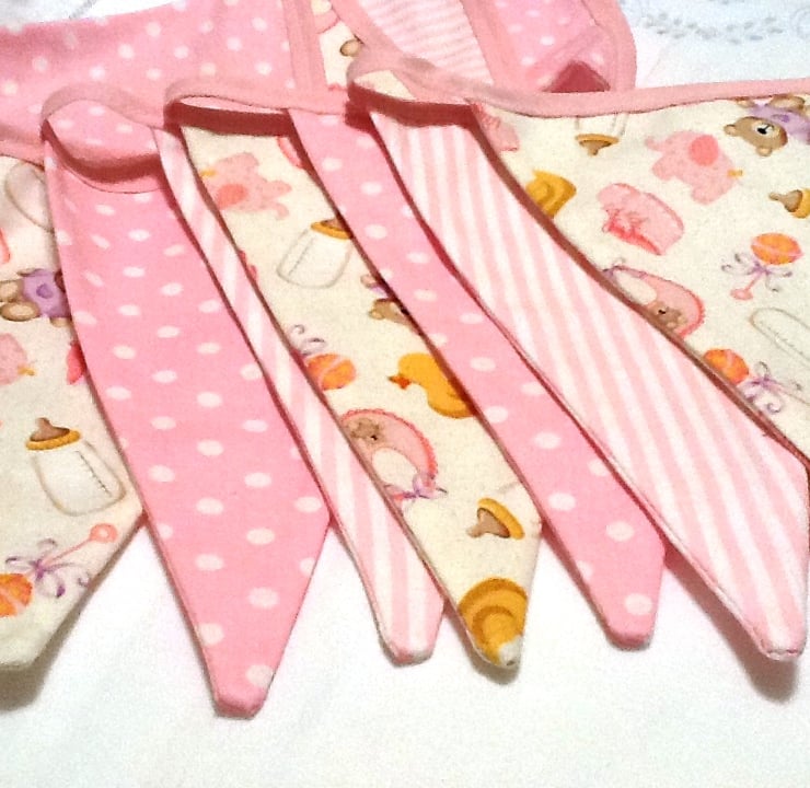 A 12 flag bunting comprising a of a cute fabric with dummies, booties, ducks, teddies, and rattles, as well as a pink and white spot and stripe fabric.