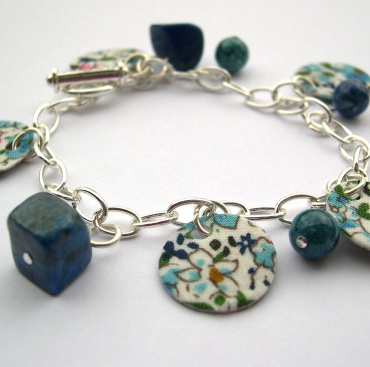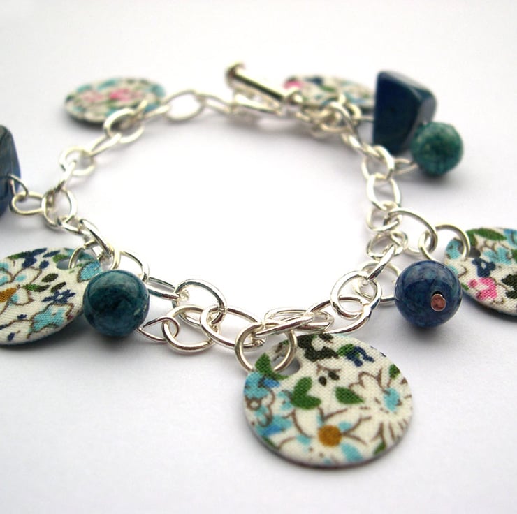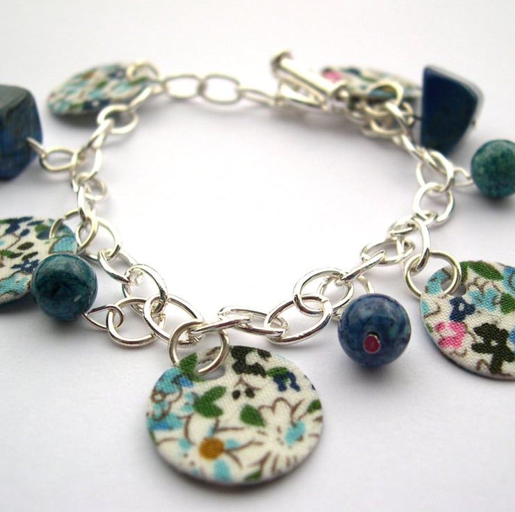 This beautiful and unique charm bracelet has been created from offcuts of a vintage style print fabric which have been hardened and cut to a disc shapes. The bracelet also has semi precious stones attached set upon a silver plated charm bracelet.