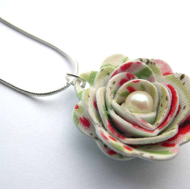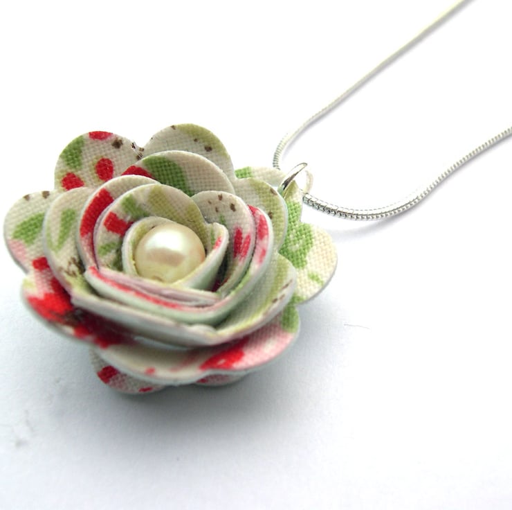 This unusual necklace has been created from offcuts of an cath kidston print fabric which has been hardened and hand sculpted into a rose shape, with faux pearl inside. It has then been attached to a silver plated snake chain necklace with silver plated lobster fastening.