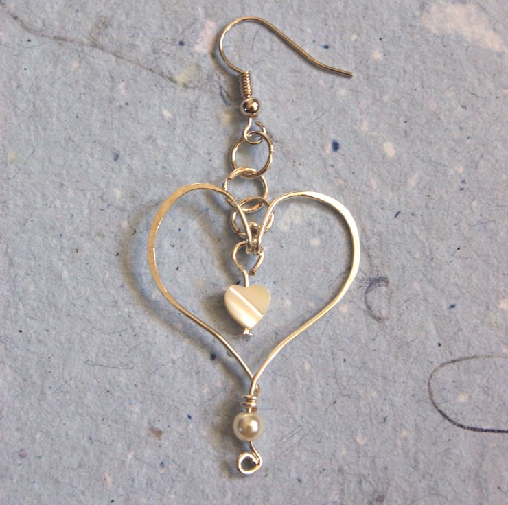 A tiny mother of pearl heart hangs in a larger, silver, wirework heart which is finished with an ivory pearl.