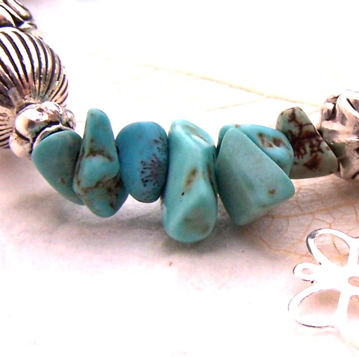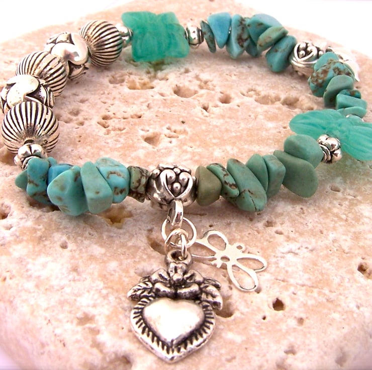 I have used co-ordinating turquoise stone chips and silver coloured beads, which go together so well. The bracelet is finished with a pretty heart charm.