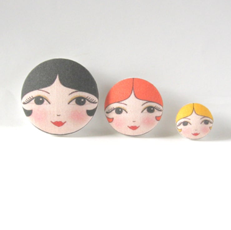 The doll face image on these fabric covered buttons is hand drawn (by me) and digitally printed on to 100% quilt weight cotton. The buttons have plastic shanks and measure: