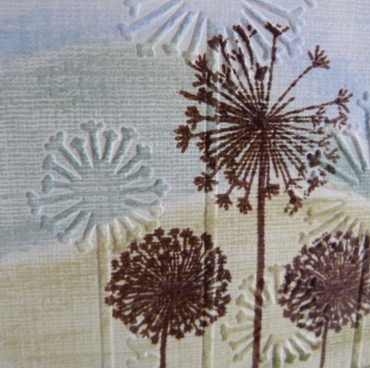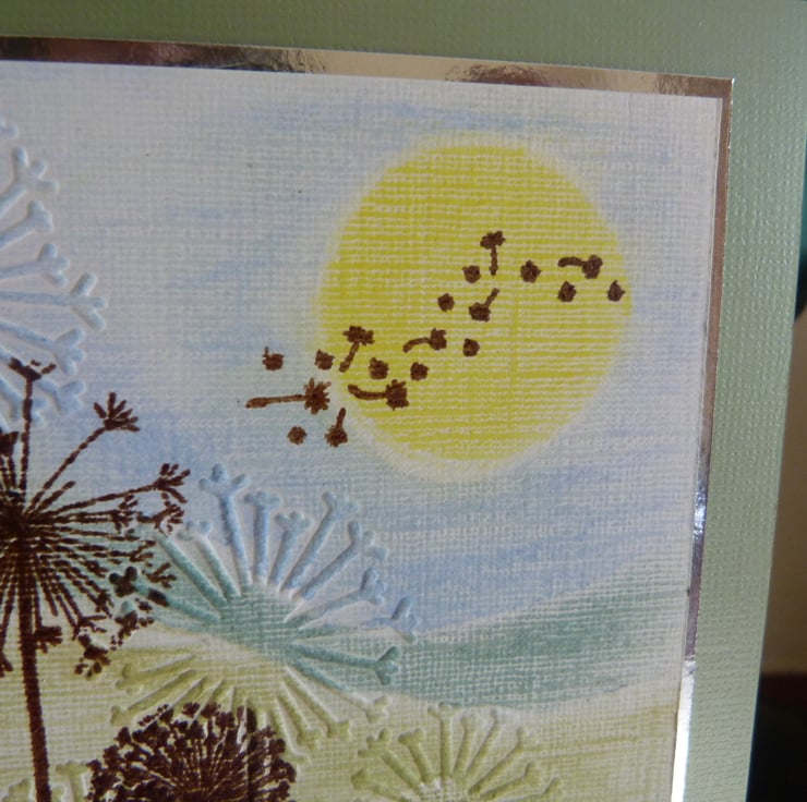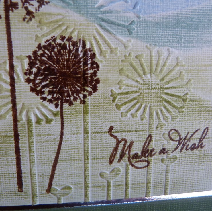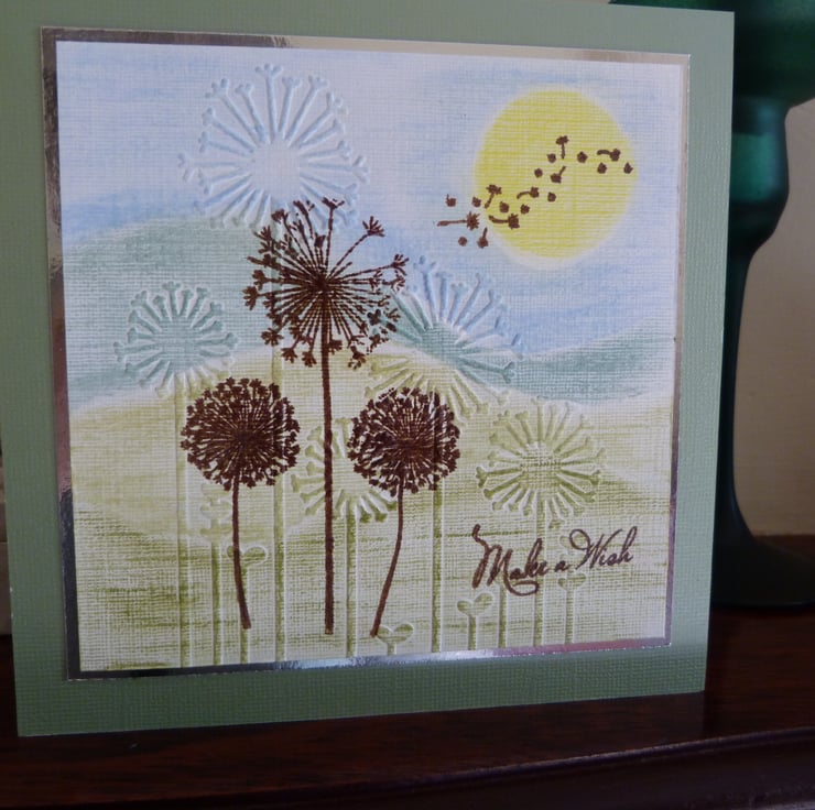 A countryside scene hand drawn and coloured with pastel chalks, deep embossed with dandelions and then stamped and heat embossed with further dandelion heads. Make a Wish heat embossed to finish off. All on quality linen card, mounted onto silver mirri card and then onto green metallic card and then onto quality white card.