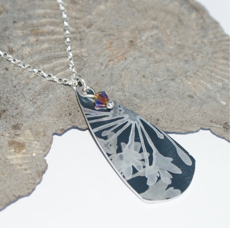 A striking pendant made from hand printed and dyed aluminium that has been cut into shape by hand. The pattern is floral and the necklace has a smoky bicone bead detail. Hung from a 16 inch sterling silver chain. Please note I make this necklace to order so may vary slightly from the image.