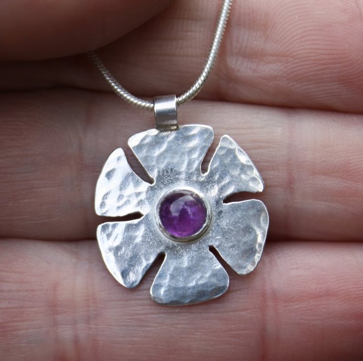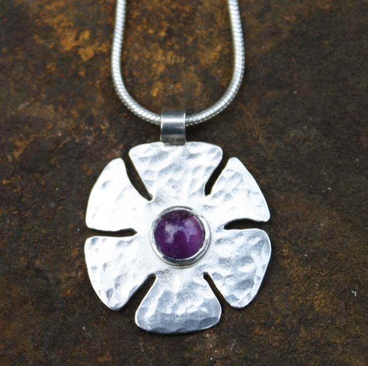A simple lightweight sterling silver flower pendant, pierced and planished , then burnished to a bright shine, set with an amethyst cabochon .