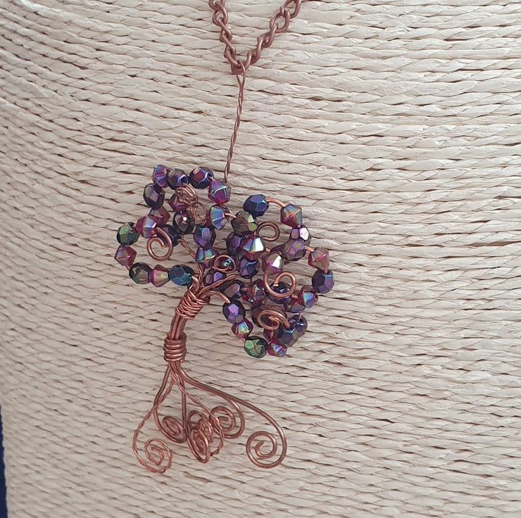 This 18 inch chain necklace has been created by hand using glass crystal beads in plum red & dark green, inspired by the autumn leaf acer tree, with copper wire shaped by hand to form a japanese acer tree with its roots. It measures approximately 2.75 by 2 inches at its highest & widest points. It is hung on a copper tone chain with a handcrafted copper wire hook clasp. It will be sent in a gift box.