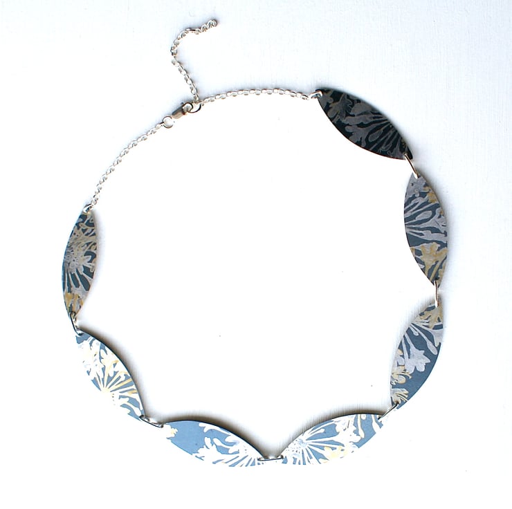 A striking necklace made from hand printed and dyed aluminium that has been cut into seven leaf shapes and linked with sterling silver wire and chain. The pattern is a floral based. Please note your necklace may vary slightly as I will make this item to order.