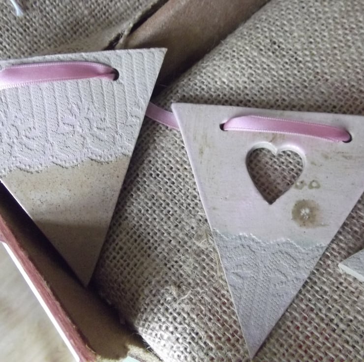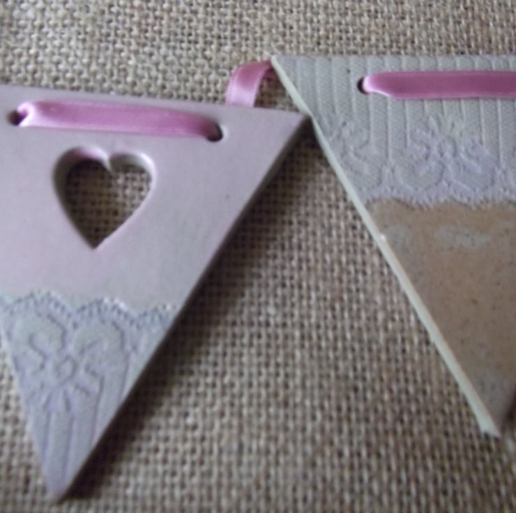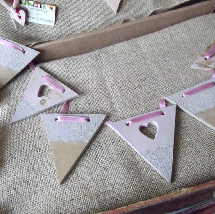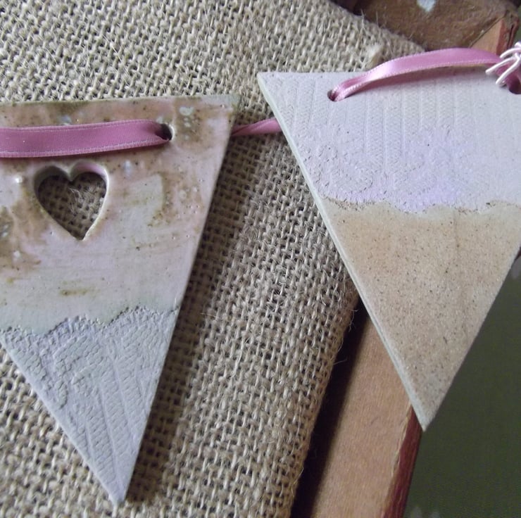 Beautiful, contemporary and slightly different, this ceramic hanging bunting is individually handmade from stoneware clay. Once rolled by hand, antique lace is impressed into the clay and the shape is cut, decoration is added using a heart cutter. The decorations are twice fired and finished with a really unique glaze. Hang with the pink ribbon whever you wish!