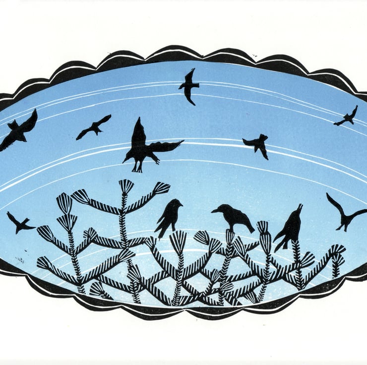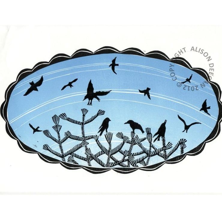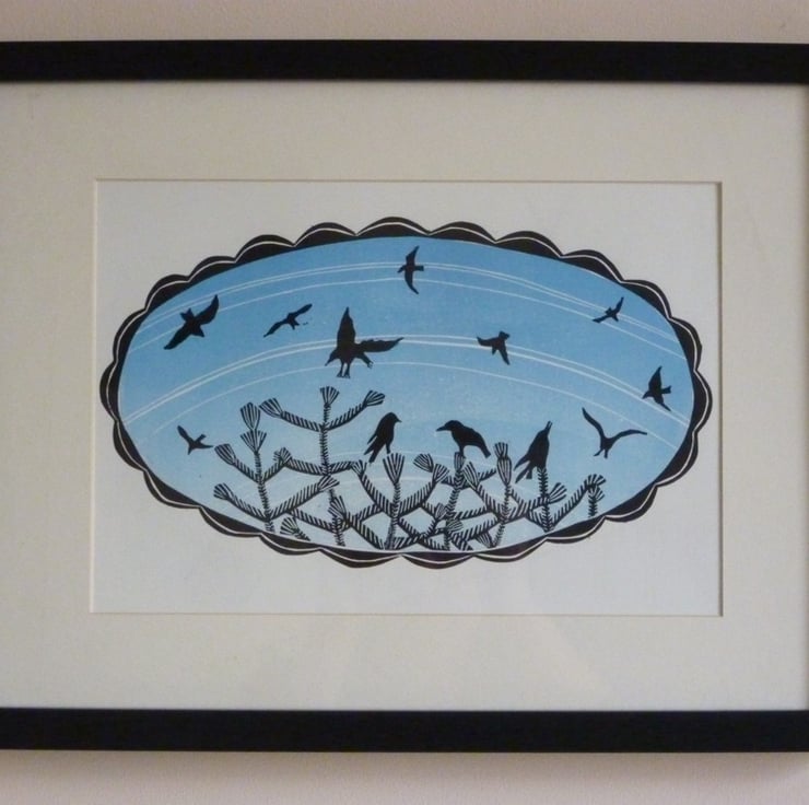 This is an original lino cut printed with a blended blue background and silhouetted black details. I have used oil-based but water washable inks and a lovely crisp white Zerkall paper.