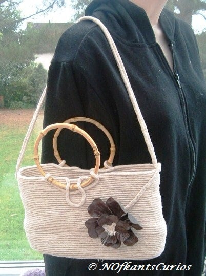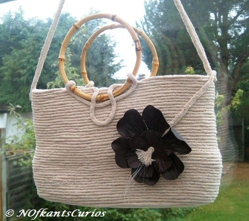 Anastasia Orchid , is a unique hand sewn handbag, made from coiling & hand sewing a 30 meter length of cotton cord, or rope, to form the body of the handbag, supported with two round bamboo styled handles and a short rope shoulder strap.