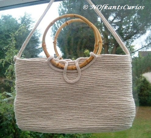 This is a unique handmade handbag, in cream coloured 100% cotton rope, the rope structure is reinforced with central plastic filaments, so is a very sturdy item, keeping its shape but still allowing it to be flexible.