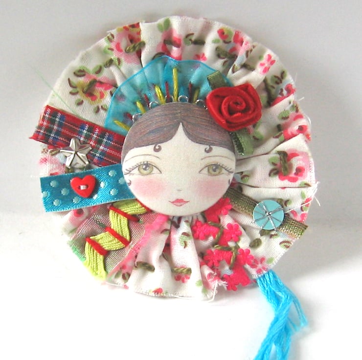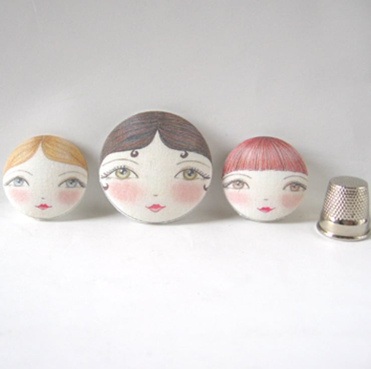 The delicate doll face images on these unique little fabric covered buttons are hand drawn (by me) then I have them digitally printed on to 100% cotton poplin and hand sew the fabric on to button blanks to ensure correct placement of the doll face. This degree of detail is quite unusual for a button, I use them to make brooches (pls see photograph) however they can be used to embellish all sorts of items. They come nicely packaged and make an unusual little present. Hand wash in cool water.