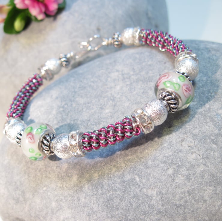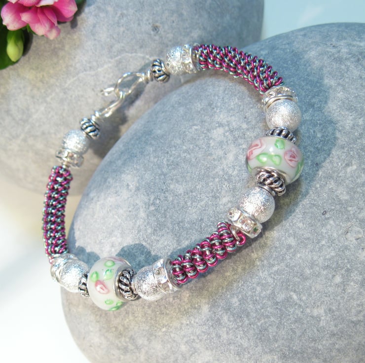 Pink, Aqua blue and silver wire wrapped bangle interdispersed with white flowered glass pandora style beads, silver plated stardust beads and tibetan beads.