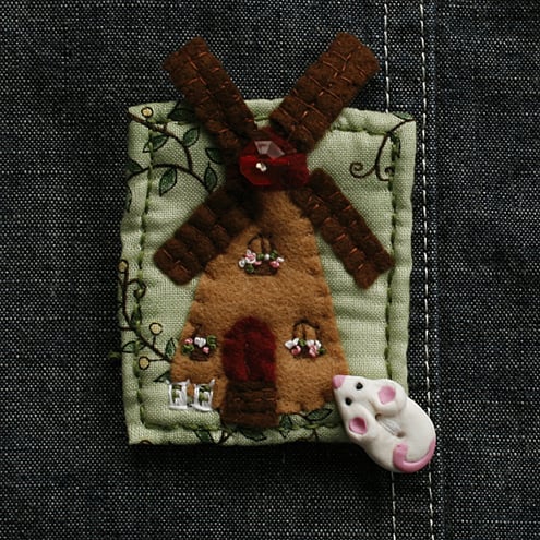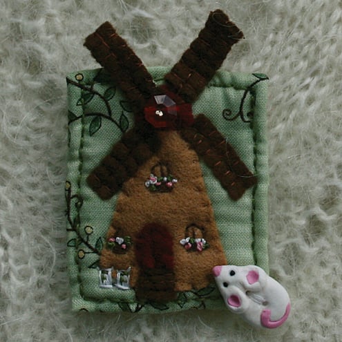 The windmill is hand appliqueed and embroidered onto a cotton fabric background. The brooch is lghtly padded with a 'felted' wadding.