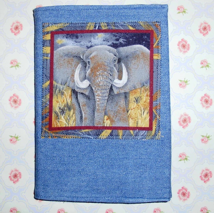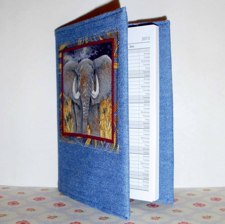A6 fabric covered diary. The diary is made from a lovely soft denim fabric, with a featured elephant panel. Complete with standard week to view diary, refills are easily available, for the next year.