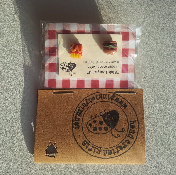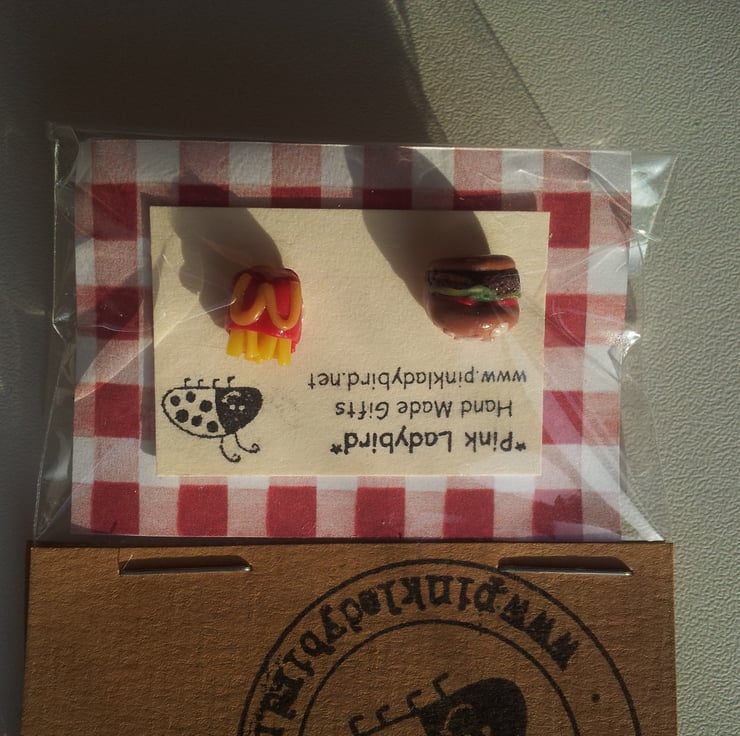 These Little stud earrings are Hand made from polymer clay. The stud is silver plated. They would make a super gift for the fast food lover! It would make a good stocking filler for Christmas.