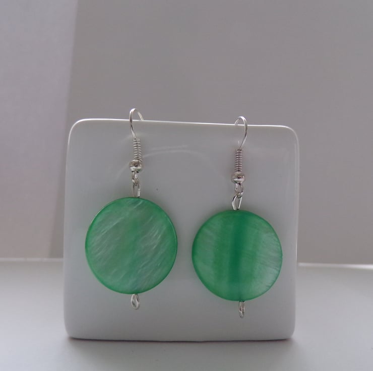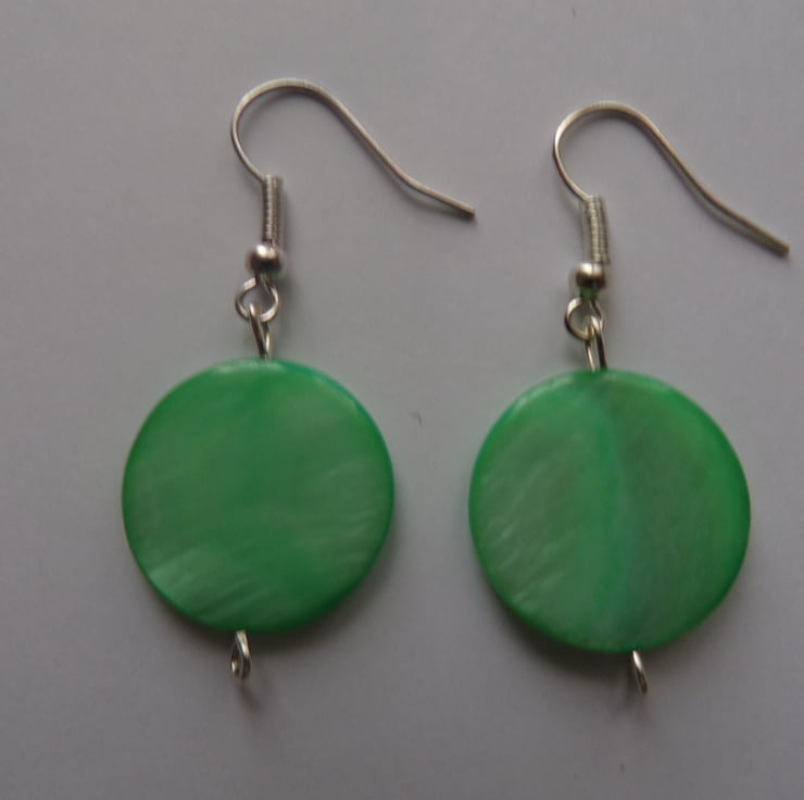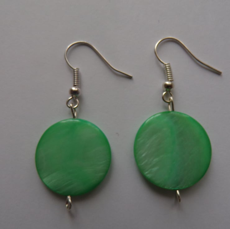 Shell Earrings, Green Shell earrings, measuring approx 2cm in diameter, the ear-wire is nickle free silver plated. The earrings will be sent to you in a pretty fabric bag, tied with ribbon (material may differ from that shown in picture).