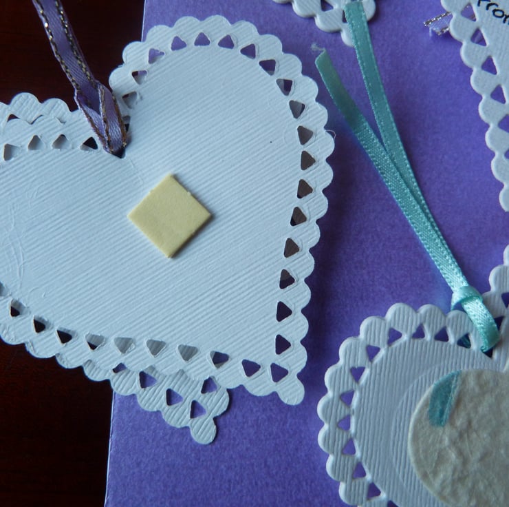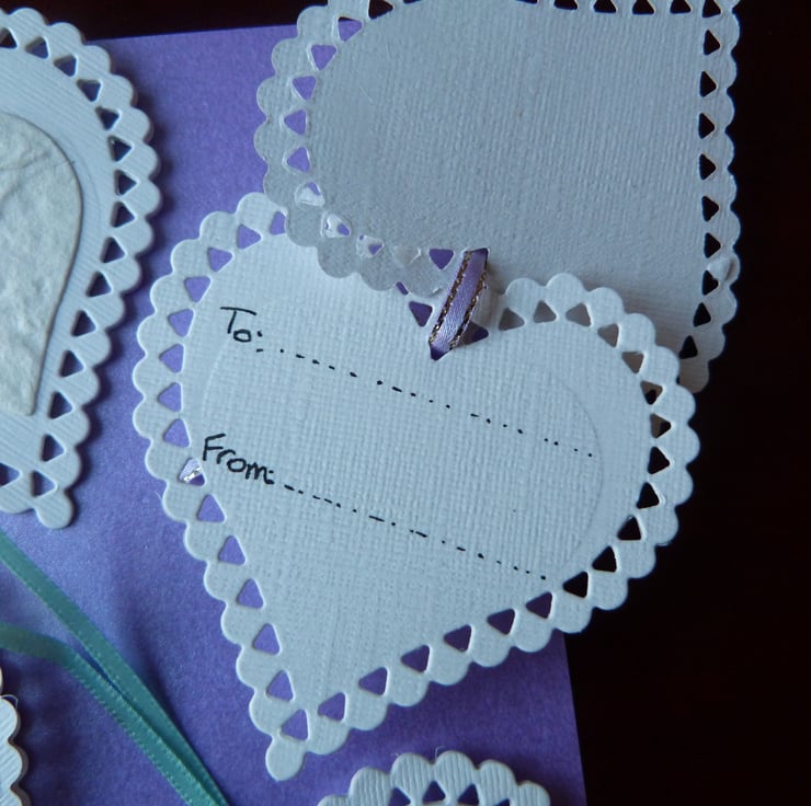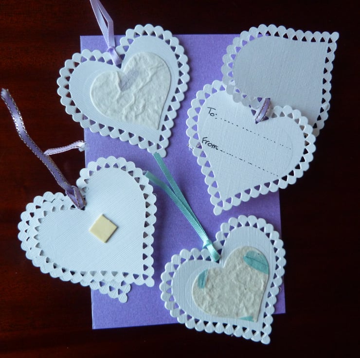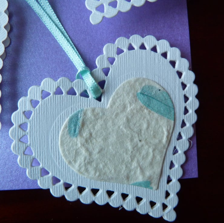 A set of four heart shaped gift tags die cut from quality linen paper. Decorated with a smaller heart cut from hand made paper with matching leaves. A matching heart underneath with to and from hand written. Finished off with co-ordinating ribbon and a peel off to make it east to attach to gift.