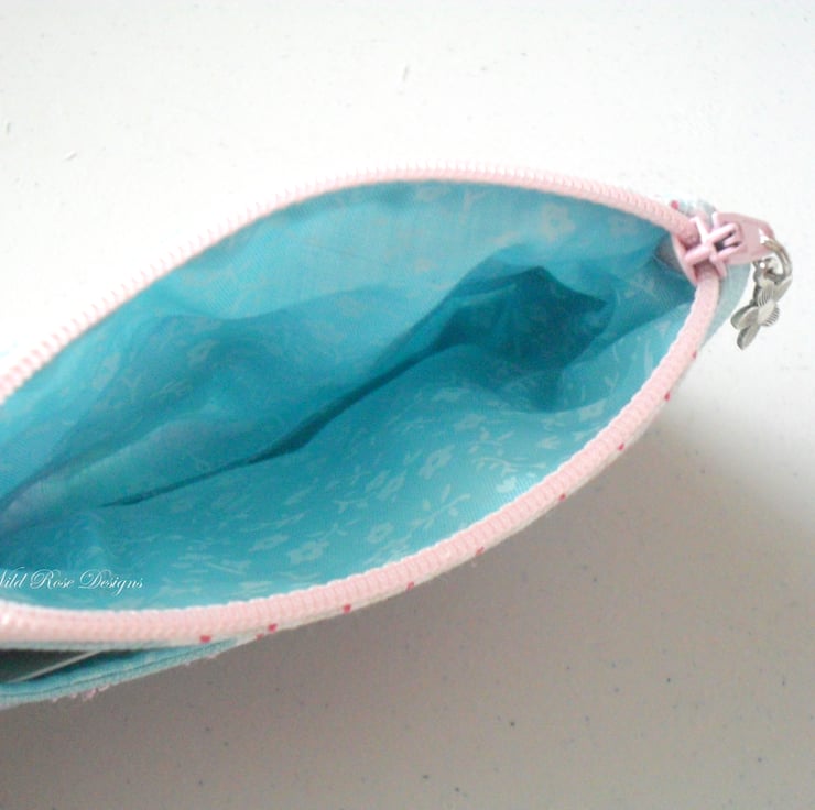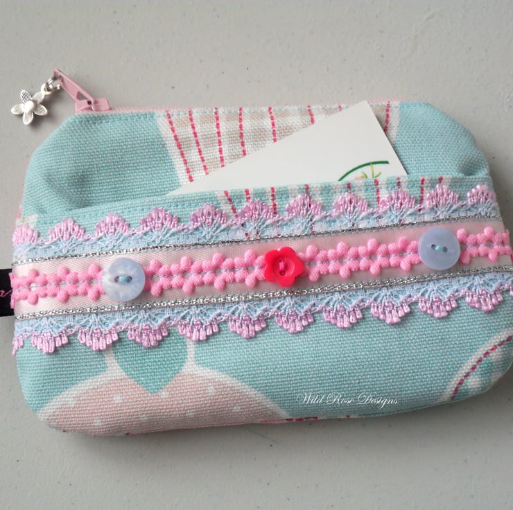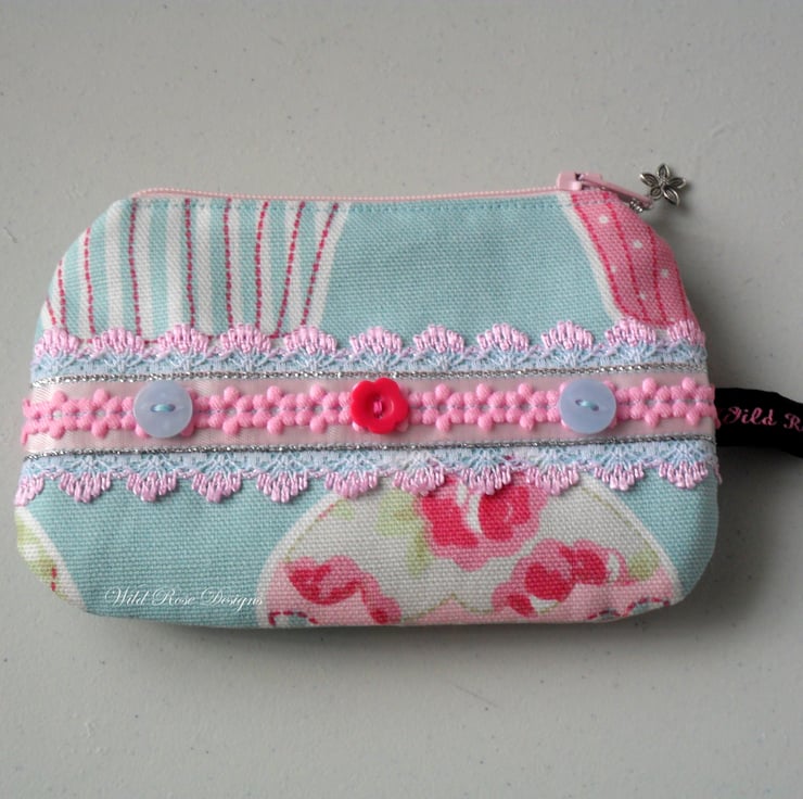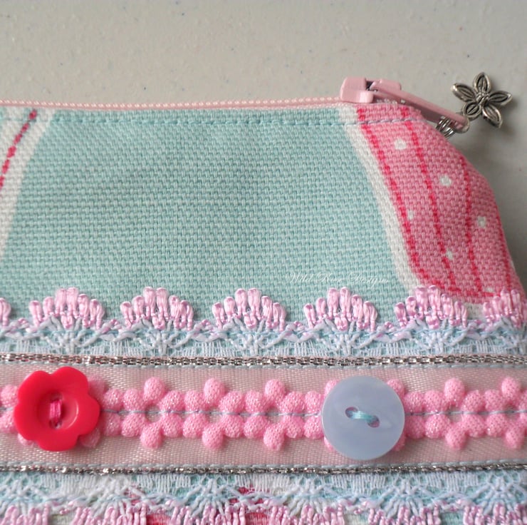 A really pretty little purse decorated with lace, ribbons and buttons and with a slip pocket on the back for cards, tickets etc. It is lined in a blue cotton print and closes with a pink zip. The zip pull has a charm attached.