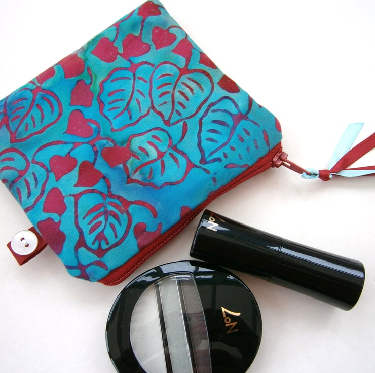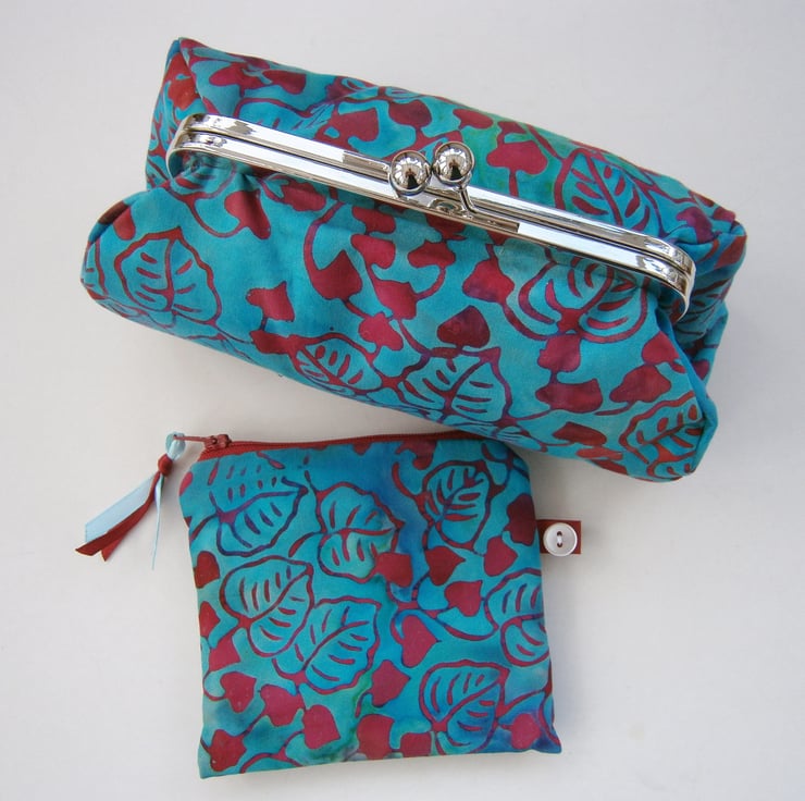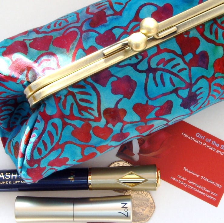 Perfect little clutch for your mobile phone, keys, sunglasses, change and credit cards or even a make-up bag. Pretty turquoise fabric with contrasting lining, padding and metal frame clasp.