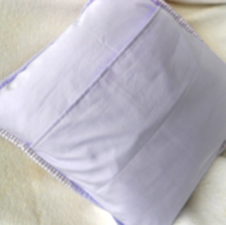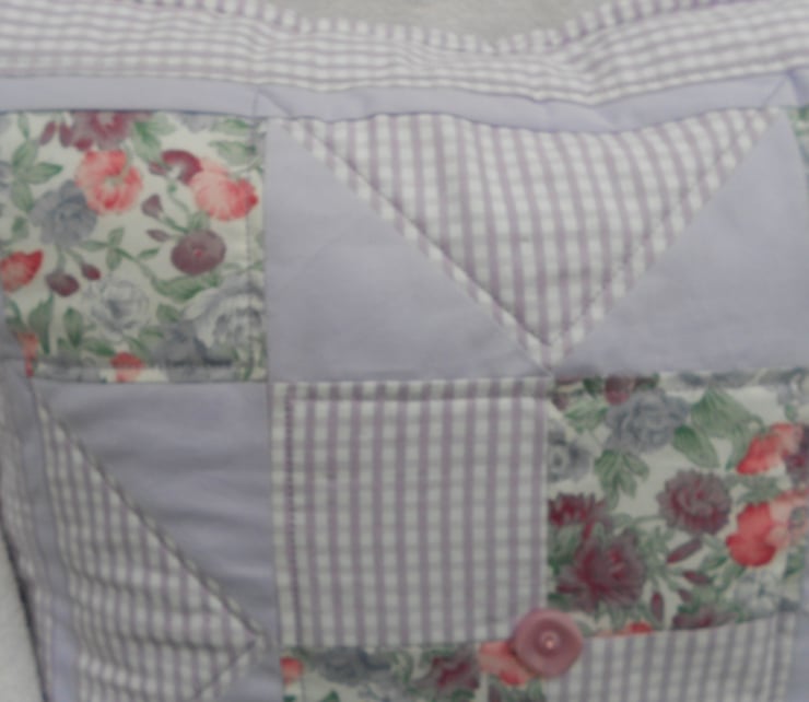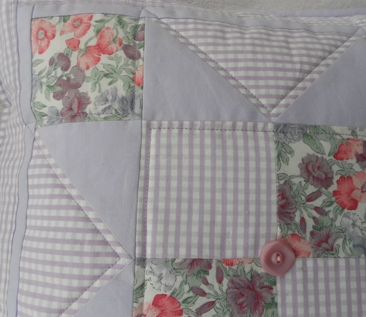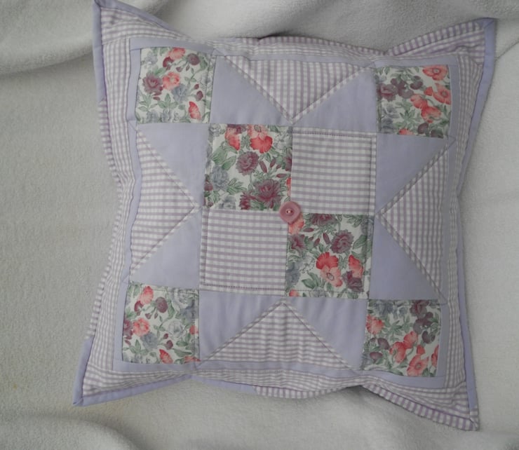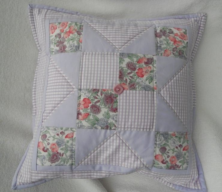 This unique 100% cotton cushion cover combines 3 fabrics in delicate shades of lavender, pink and green forming the traditional patchwork block design 'Indian Star'. Machine quilting stitches surround the star pattern to give the cover added dimension. A button from my Grandmother's button tin provides the finishing touch!