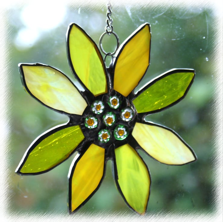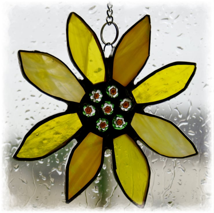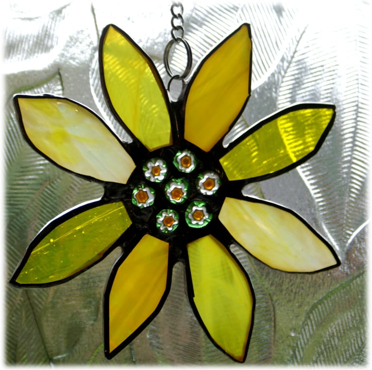 It is a gorgeous bright yellow sunflower with 8 petals made from 4 different shades and textures of lovely steaky and textured sunshine yellow glass. At the centre are 7 pretty little millefiori beads.