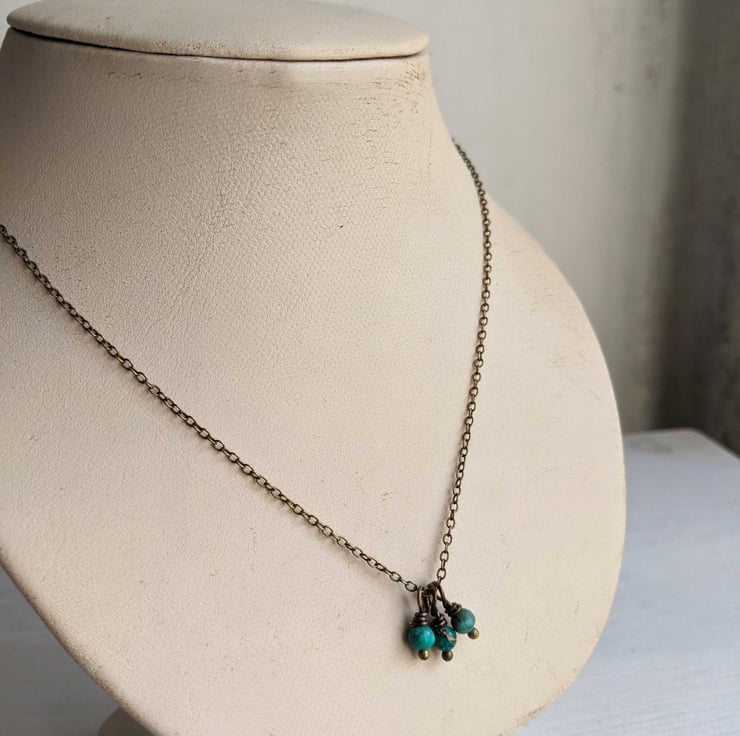 Three beautiful turquoise gems in a petite cluster. Hung simply on fine bronze chain.