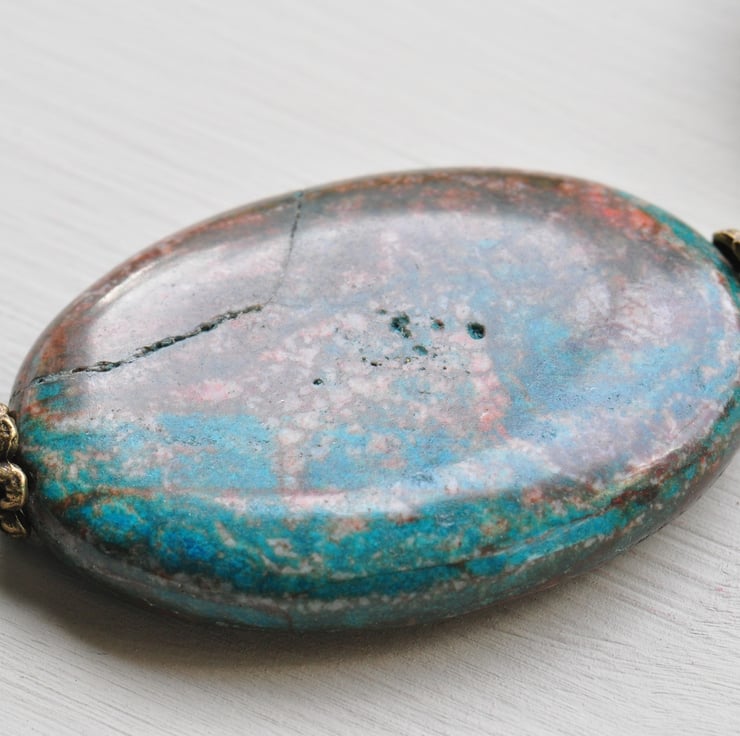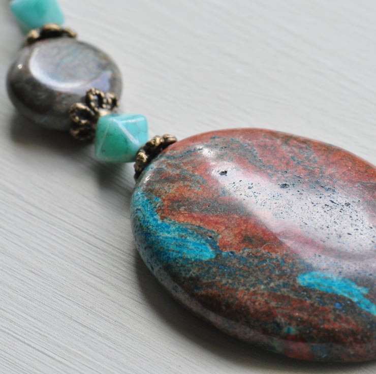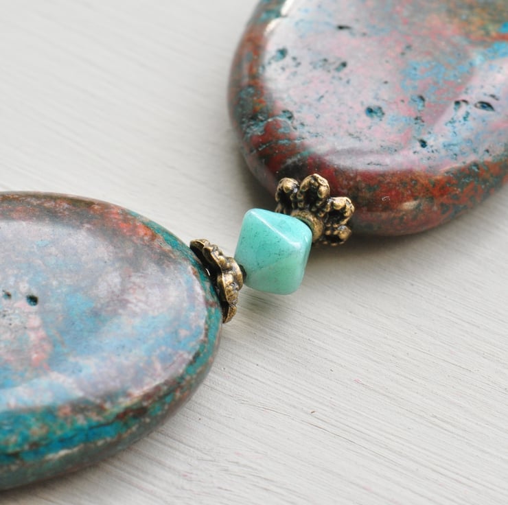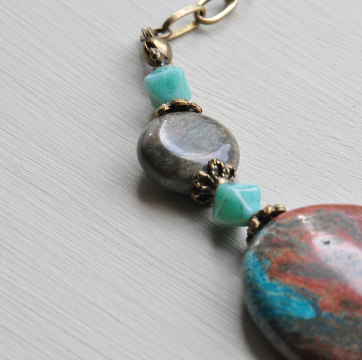 Necklace made using stunning Riban (otherwise known as Riband) Jasper oval gemstones, Czech aqua opal glass bicone beads and Riban Jasper gemstone coin beads with little antique bronze beadcaps and antique bronze chunky chain and finished with a trigger clasp.