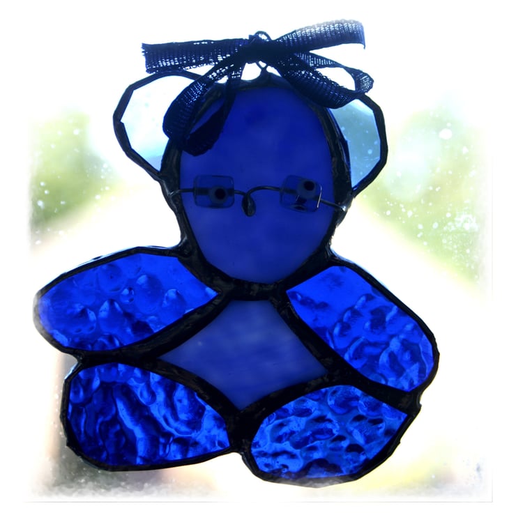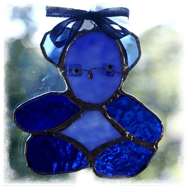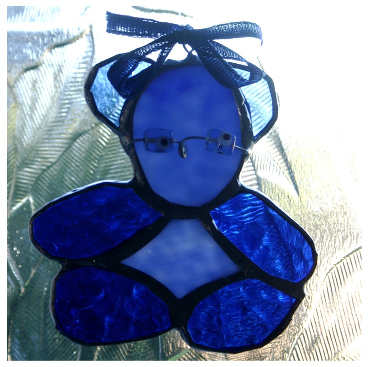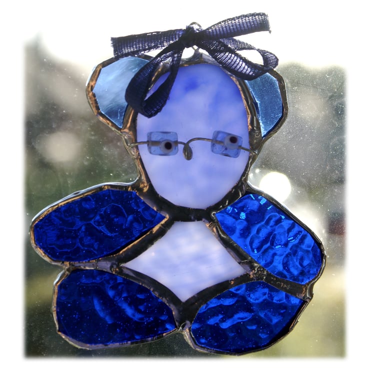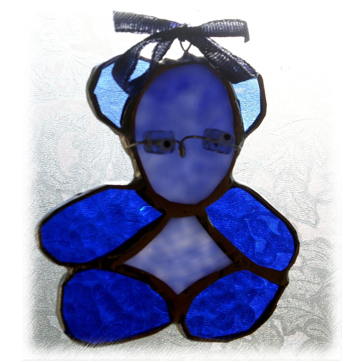 It looks lovely hanging in the window where it shines and catches the light. The suncatcher hangs from strong loop of fishing line which is securely attached to the top of the teddy via a soldered ring..