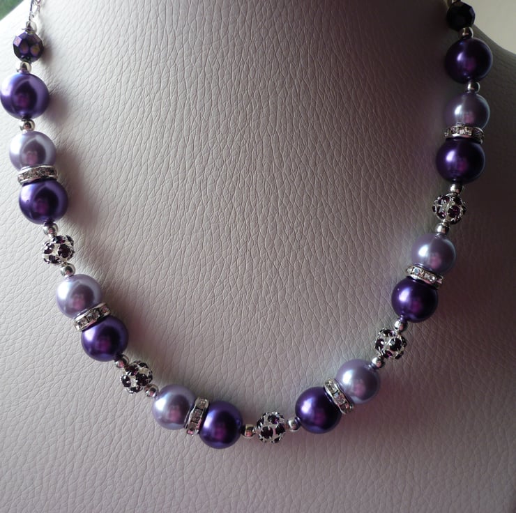 THE NECKLACE HAS BEEN MADE WITH 12MM GLASS PEARLS IN SHADES OF PURPLE AND LAVENDER ALONG WITH SILVER PLATED AMETHYST RHINESTONE BALL BEADS, SILVER PLATED RHINESTONE RONDELLE BEADS, SILVER PLATED SMALL SILVER PLATED SPACER BALL BEADS AND FINISHED WITH SILVER PLATED MEDIUM CHAIN, LOBSTER CLASP AND FINDINGS.