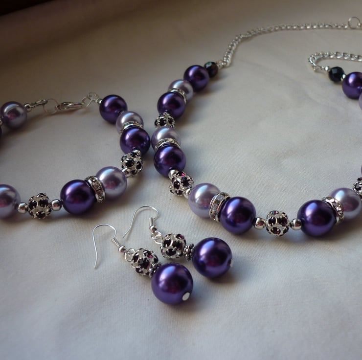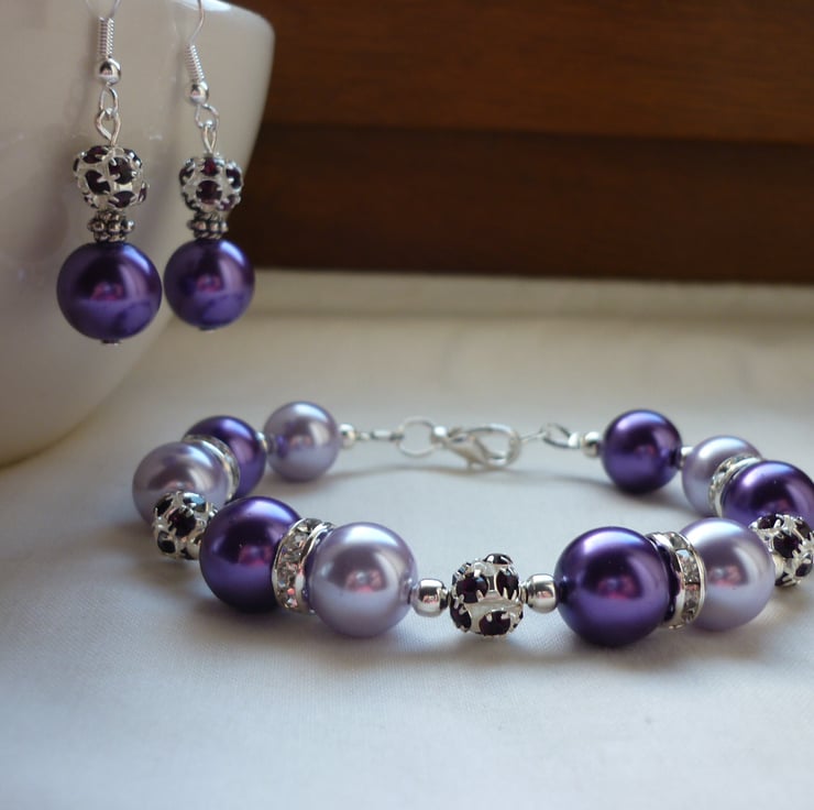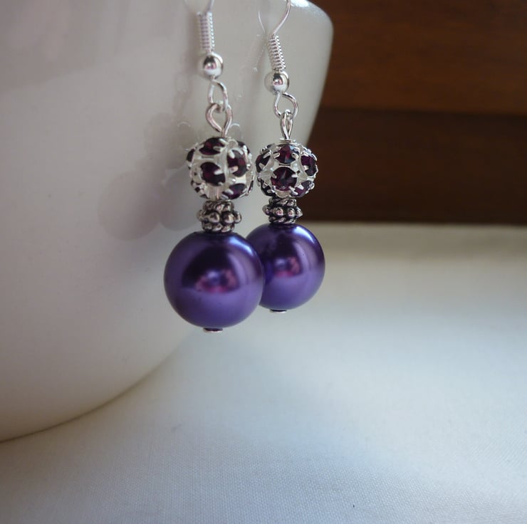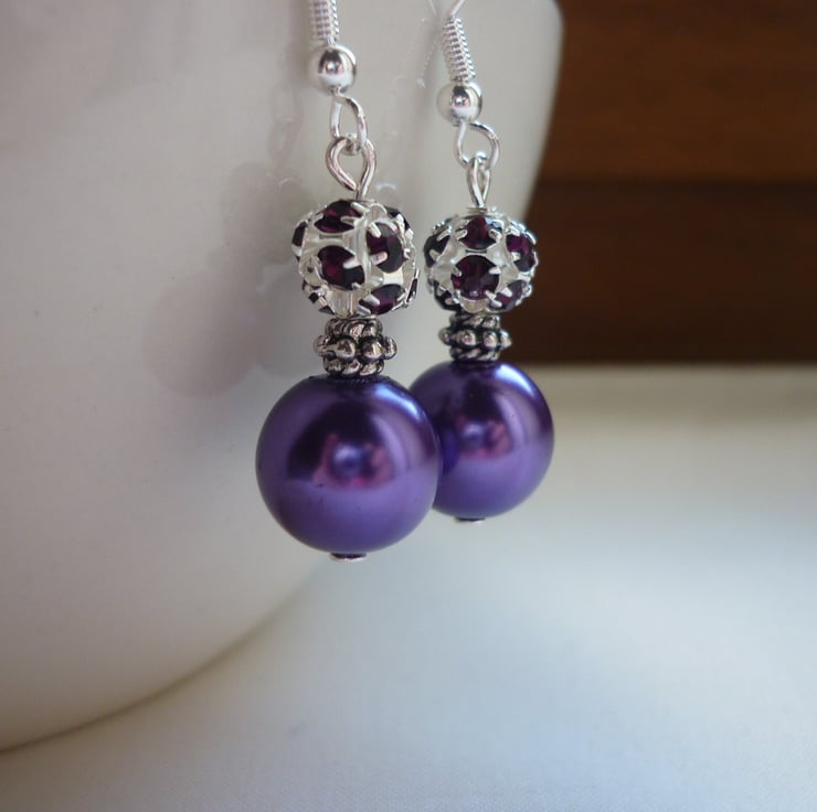 THE EARRINGS HAVE BEEN MADE WITH 12MM GLASS PEARLS IN THE SHADE OF PURPLE ALONG WITH SILVER PALTED AMETHYST RHINESTONE BALL BEADS, SILVER PLATED SPACER BEADS AND FINISHED WITH SILVER PLATED FISHHOOK EARRING WIRES.