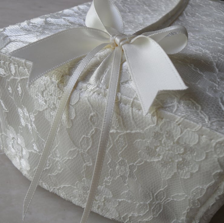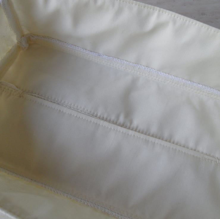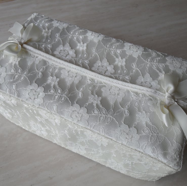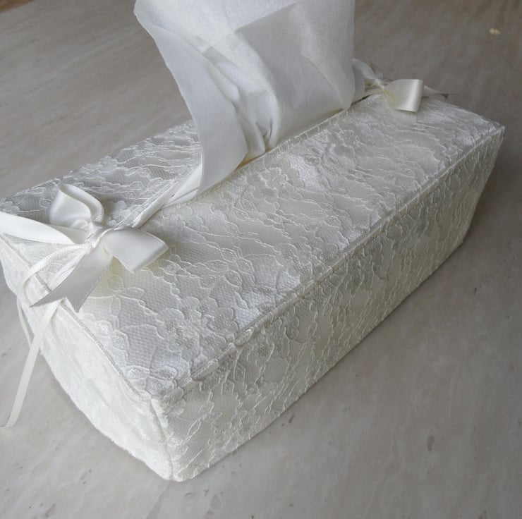 This tissue box cover is made from 3 types of fabric (lace, satin crepe and cotton) . The cover is made with precision and care to achieve the exact fitting. Whole cover is lined with lining, interfacing and also all edges are neaten. This cover is made to fit a standard rectangular tissue box. The size is H 2.75" W 9.25" D 5".