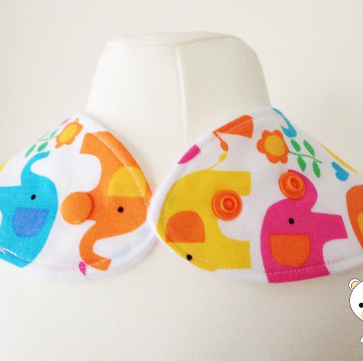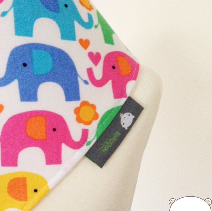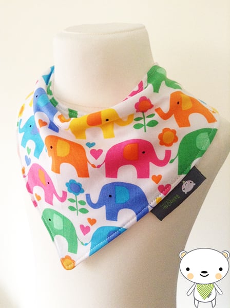 Gorgeous Handmade Bandana Dribble Bib made in Bright Funky Multi-coloured "ELEPHANTS" on a white background. Made from 100% Cotton and lined with an ultra soft and absorbent fleece fabric to keep clothes dribble free and looking ULTRA cute!
