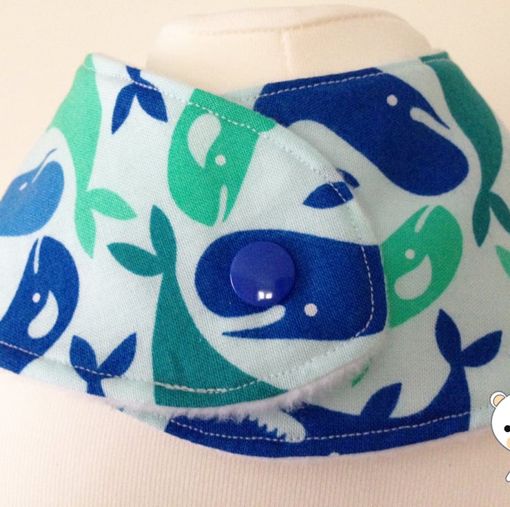 Gorgeous Handmade Dribble Bandana Bib made in 100% Cotton Bright Funky Blue/Green "WHALE" Fabric by Eleanor for Free Spirit by Westminster Fibres - Perfect for your gorgeous little girl or boy! Made from 100% Cotton and lined with an ultra soft and absorbent fleece fabric to keep clothes dribble free and looking ULTRA cute!