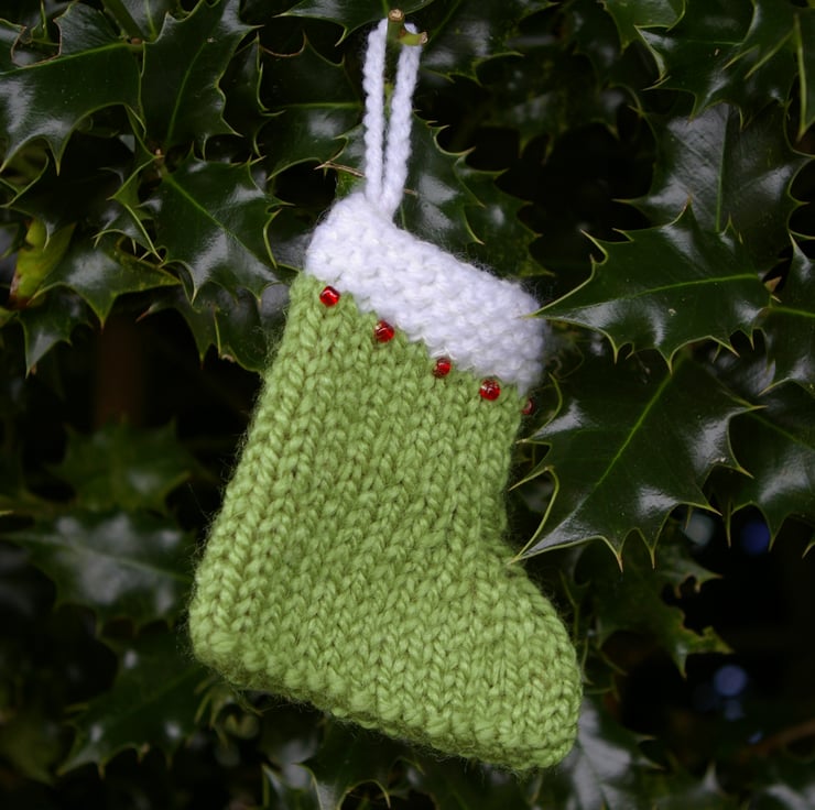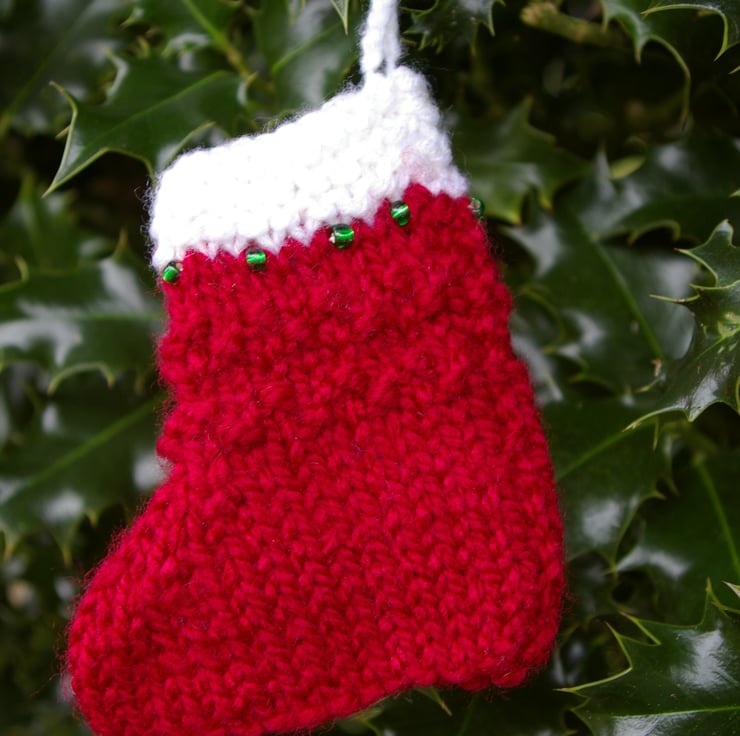 A trio of little hand knitted Christmas stocking decorations that will look great hanging from a Christmas tree, adoring a Christmas window, or hanging off door handles. They are big enough to place a little treat into. Each one is different two are red with either a row of green or white beads sewn around their tops, while the third is green with a row of sewn red beads. All are topped in white and have a little white crochet hanging loop.