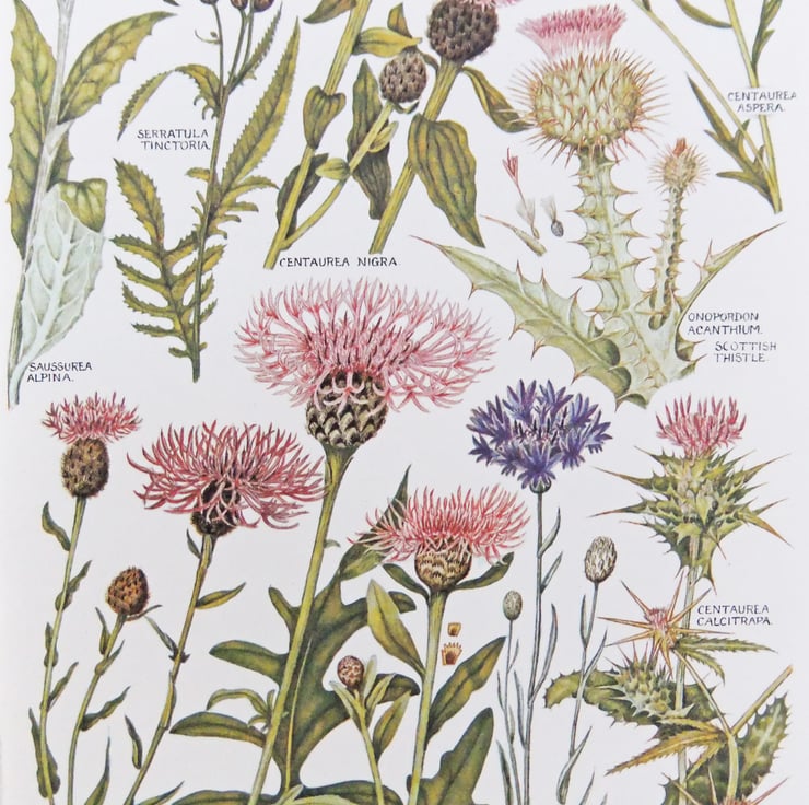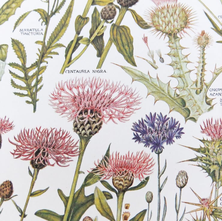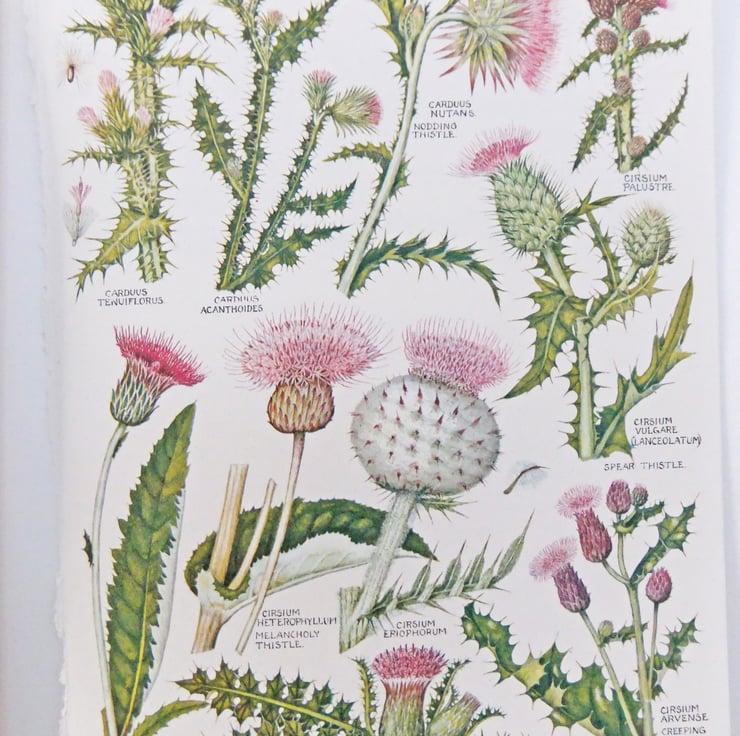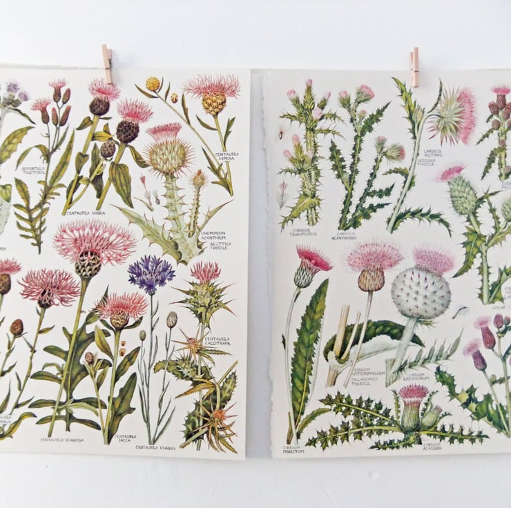 These fabulous botanical drawings were rescued from a vintage 1965 copy of ‘The Concise British Flora in Colour’ by Keble Martin. The Reverend William Keble Martin drew these fabulous botanical flower illustrations in England over a period of 60 years in the early 20th century. He has added the Latin names to his illustrations so you can have fun spotting the flowers you may know and learning their Latin names! These pages have a great collection of thistles!