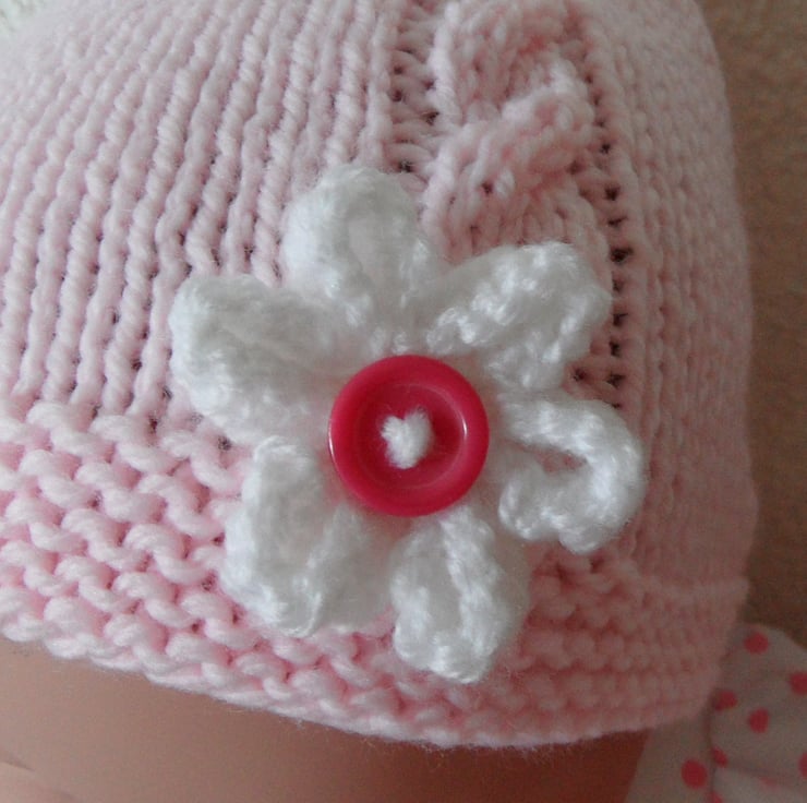 A beautifully soft baby pink hat, with rows of cable and white flower and button detail.