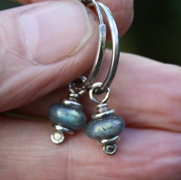 Stunning teal green flash labradorite beads have been combined with oxidised silver to make these eye catching earrings.